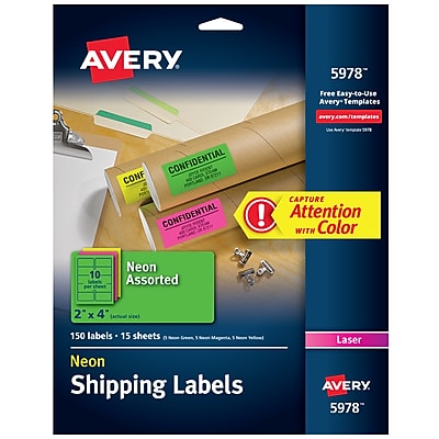 Avery(R) High Visibility Shipping Labels, 2" x 4", Neon Assorted, 500 ... For long lasting hold on any surface, these strong stick 2"x 4" neon labels are designed with a permanent adhesive. Expect high-quality, smudge free printing results with these laser printer optimized neon labels. Print your neon Avery labels without any jams or misalignments using Avery Sure Feed technology Make your next project or shipment ...